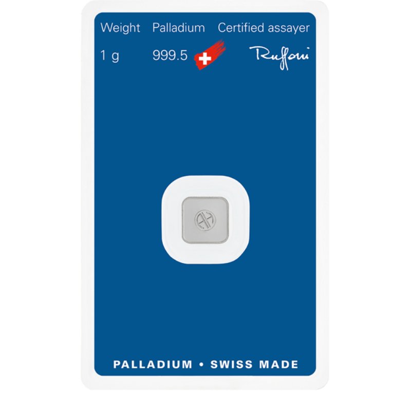 Jeder Barren trägt die typischen Kennzeichnungen von Argor-Heraeus: Gewicht (1 g), Feinheit (Pd 999,5) und den Herstellerstempel. Die Lieferung erfolgt sicher verpackt im Original-Blister.