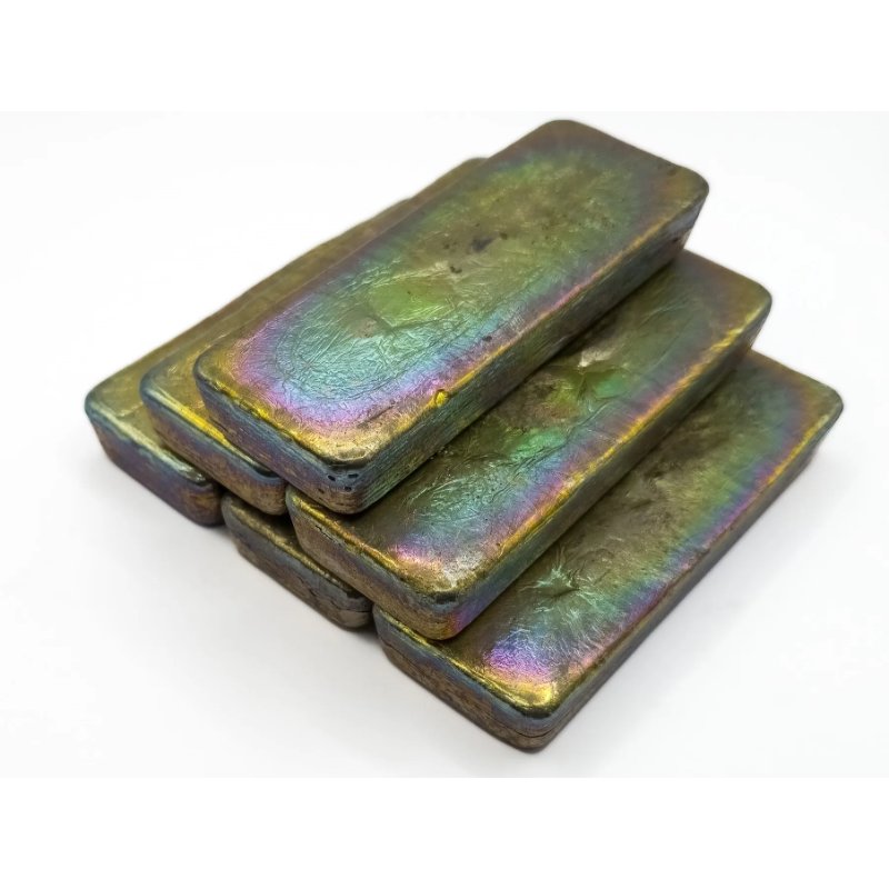 Dieser 1 kg Barren aus hochreinem Bismut (99,99 % / 4N) ist sowohl optisch ansprechend als auch vielseitig einsetzbar. Im Vergleich zu Bruchstücken oder Großblöcken ist die Barrenform eine praktische und ästhetische Alternative mit handlichen Maßen von ca. 125 × 45 × 20 mm.